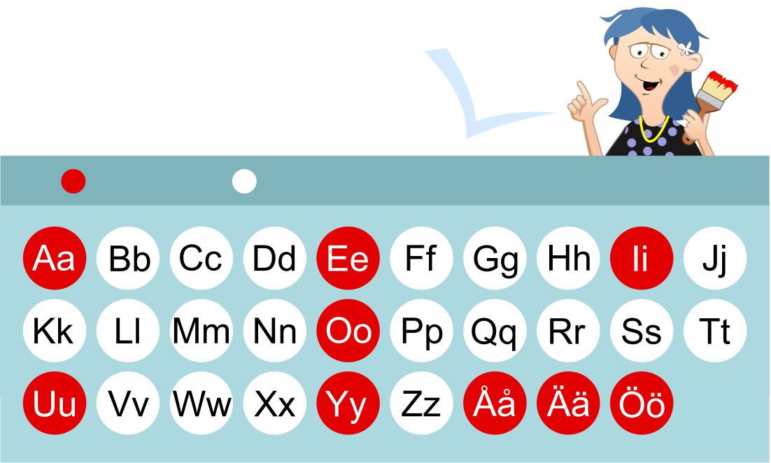 Bokstäverna a,e,i,o,u,y,å,ä,ö kallas för vokaler. De har jag målat röda här nedanför. Alla andra bokstäver kallas för konsonanter.