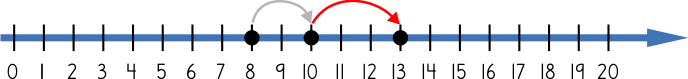 Vastaukseksi tulee: 8 + 5 = 13Vi har 3 igjen å legge til. Da havner vi på 13.