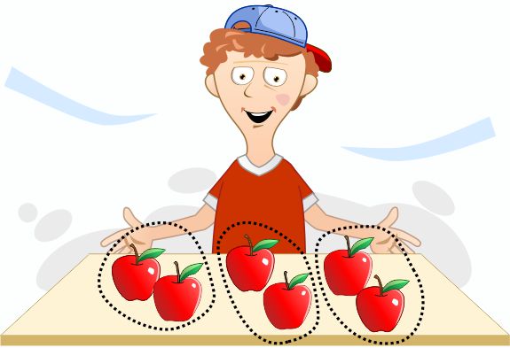 Då blir det 2 i varje grupp.I have 6 apples. I divide them into 3 groups.