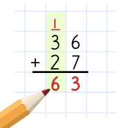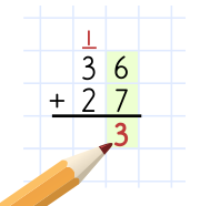 Ibland måste man använda en "minnessiffra". Så här adderar du talen 36 och 27.[en:t_21]Joskus tarvitsee käyttää "muistinumeroa"". Näin lasket yhteen luvut 36 ja 27.Noen ganger må man bruke en "minnesiffer". Slik adderer du tallene 36 og 27.
