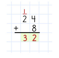 Ibland måste man använda en "minnessiffra". Så här adderar du talen 24 och 8.Joskus täytyy käyttää Noen ganger må man bruke en "minnesiffer". Slik adderer du tallene 24 og 8.