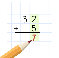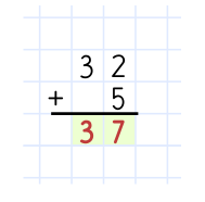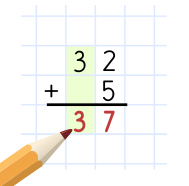 Summaksi tulee 12. Kirjoita ykkösluku 2 viivan alle. Nyt sait summaan myös kymmenluvun, kirjoita se seuraavan sarakkeen yläosaan muistinumerona.Begynn fra høyre og addere enerne.