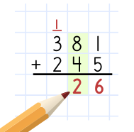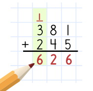 381 + 245 = 626[en:t_5]Lisää sitten sadat, äläkä unohda muistinumeroa.