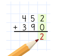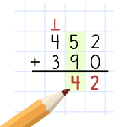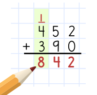 Ibland måste man använda en "minnessiffra". Så här adderar du talen 452 och 390. Sometimes you have to use a "memory digit". This is how you add the numbers 452 and 390.Joskus täytyy käyttää "muistinumeroa"". Näin lasket yhteen luvut 452 ja 390."Noen ganger må man bruke en "minnesiffer". Slik adderer du tallene 452 og 390.