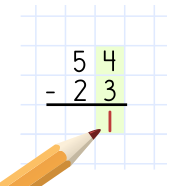 Skriv 4 under strecket.[en:t_24]Nyt voit tehdä vähennyksen ykkösistä.