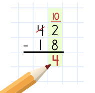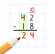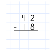 42 - 18 = 24Gå så til titallene. Vi har tatt fra 4-eren, så det er bare 3 igjen.