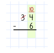 4 - 6 går inte. Då måste du ta från tiotalen.