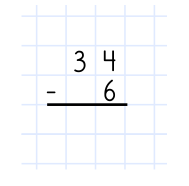 34 - 6 = 28Gå så til titallene. Vi har tatt fra 3-eren, så det er bare 2 igjen.