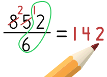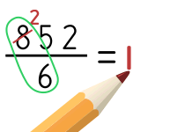Nu ska vi öva mer på kort division. Så här räknar du ut 852 delat med 6.[en:t_1]Nyt harjoittelemme lyhyttä jakolaskua. Näin lasket 852 jaettuna luvulla 6.Nå skal vi øve mer på kort divisjon. Slik regner du ut 852 delt på 6.