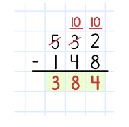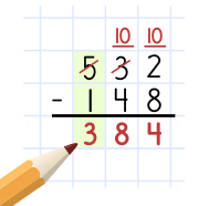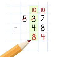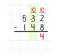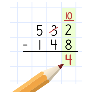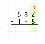 2 - 8 går inte. Då måste du ta från tiotalen.