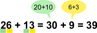 Börja med att lägga ihop tiotalen, det blir 30. Lägg sedan ihop entalen, det blir 9.
