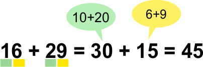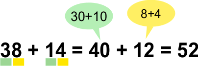 Börja med att lägga ihop tiotalen, det blir 40. Lägg sedan ihop entalen, det blir 12.
