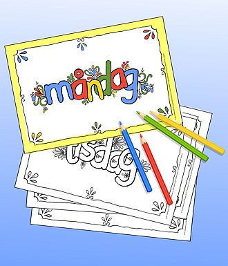 Sju färgläggningsbilder med veckodagarna. Tips: Tillsammans blir de en fin väggdekoration till klassrummet! Idé och utförande: Mia Hallenbring, speciallärare i läs- skriv- och språkutveckling.