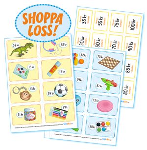 Ett roligt additions-spel för utskrift. Välj bland varorna, addera priserna och se vem som kommer närmast den givna summan. Spelet finns i två svårighetsnivåer och riktar sig i första hand till lågstadiet.