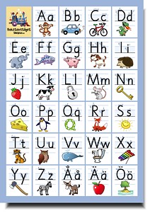 Ett alfabet i A4-storlek. Varje bokstav finns i versal och gemen variant tillsammans med en bild. Skriv ut en till varje elev som stöd för skrivträningen. Alfabetskortet finns i flera varianter, med eller utan skrivhjälp samt med eller utan markerade vokaler.