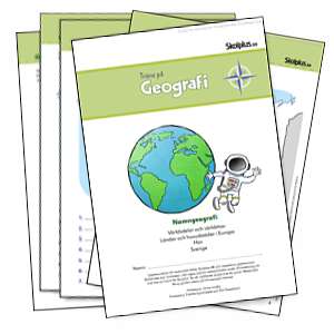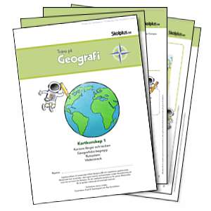 Träna på Geografi är en serie geografihäften passande årkurs 4-6. Vid utskrift väljs med fördel utskrift i full storlek (kan stå "100%", "verklig storlek" eller liknande under skrivarinställningar), då vissa övningar ska mätas med linjal.
