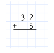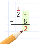 Summaksi tulee 12. Kirjoita ykkösluku 2 viivan alle. Nyt sait summaan myös kymmenluvun, kirjoita se seuraavan sarakkeen yläosaan muistinumerona.Begynn fra høyre og addere enerne.