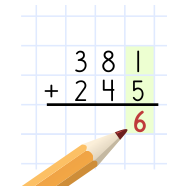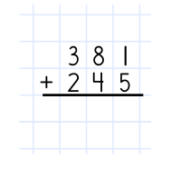381 + 245 = 626[en:t_5]Lisää sitten sadat, äläkä unohda muistinumeroa.