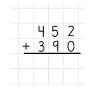 Ibland måste man använda en "minnessiffra". Så här adderar du talen 452 och 390. Sometimes you have to use a "memory digit". This is how you add the numbers 452 and 390.Joskus täytyy käyttää "muistinumeroa"". Näin lasket yhteen luvut 452 ja 390."Noen ganger må man bruke en "minnesiffer". Slik adderer du tallene 452 og 390.