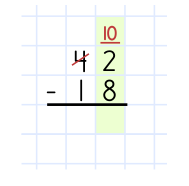 42 - 18 = 24Gå så til titallene. Vi har tatt fra 4-eren, så det er bare 3 igjen.