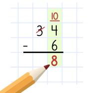 4 - 6 går inte. Då måste du ta från tiotalen.