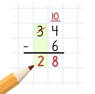 34 - 6 = 28Gå så til titallene. Vi har tatt fra 3-eren, så det er bare 2 igjen.