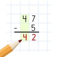 47 - 5 = 42[en:t_14]Kymmenet eivät muutu.