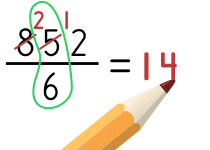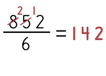 Nu ska vi öva mer på kort division. Så här räknar du ut 852 delat med 6.[en:t_1]Nyt harjoittelemme lyhyttä jakolaskua. Näin lasket 852 jaettuna luvulla 6.Nå skal vi øve mer på kort divisjon. Slik regner du ut 852 delt på 6.
