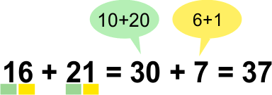 Börja med att lägga ihop tiotalen, det blir 30. Lägg sedan ihop entalen, det blir 9.