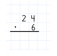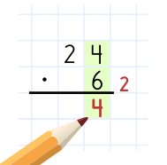 Tulo on 24. Säästä luku 2 muistinumeroksi. Kirjoita luku 4 viivan alle.Begynn fra høyre og multipliser 6 med enerne.