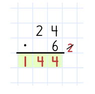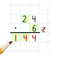 Produktet blir 24. Spar 2-eren som minnesiffer. Skriv 4 under streken.