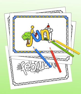 Tolv färgläggningsbilder med månaderna. Tips: Tillsammans blir de en fin väggdekoration till klassrummet! Idé och utförande: Mia Hallenbring, speciallärare i läs- skriv- och språkutveckling.
