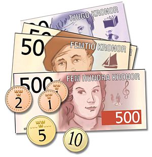 Sedlar i valörerna 20 kr, 50 kr, 200 kr, 100 kr, 500 kr och 1000 kr, samt mynt i valörerna 1 kr, 2 kr, 5 kr, 10 kr. Kan användas för olika räkneövningar.