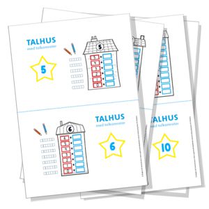 Låt eleverna träna på talkamrater för talen 3–10 med hjälp av talhus. Till vänster om husen delar eleven upp talet genom att färglägga rutorna. Sedan skrivs rätt talkamrat i husets fönster.