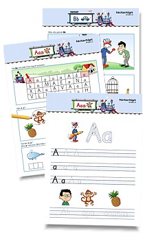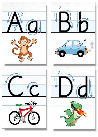 Ett alfabet i A4-storlek. Varje bokstav finns i versal och gemen variant tillsammans med en bild. Skriv ut en till varje elev som stöd för skrivträningen. Alfabetskortet finns i flera varianter, med eller utan skrivhjälp samt med eller utan markerade vokaler.