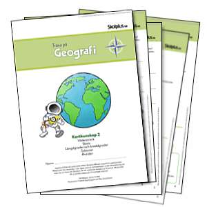 Träna på Geografi är en serie geografihäften passande årkurs 4-6. Vid utskrift väljs med fördel utskrift i full storlek (kan stå "100%", "verklig storlek" eller liknande under skrivarinställningar), då vissa övningar ska mätas med linjal.